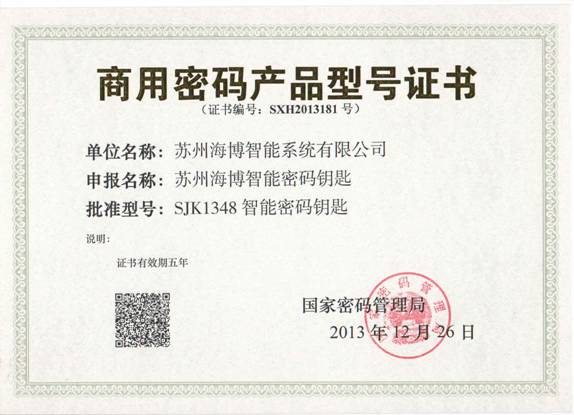 热烈祝贺海博智能多维证书云盾系列的智能密码钥匙获得国密产品型号证书