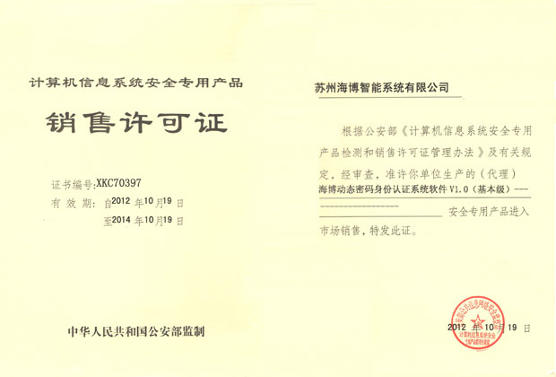海博动态密码身份认证系统软件1.0获得销售许可证