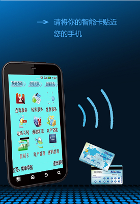 然后请将智能可视卡放到手机背后6-8cm处,轻轻刷一下,如果没有感应到智能卡或者尝试次数过多,就被拒绝进入相应的应用界面。如果智能卡和手机匹配成功,就可以进入应用界面。